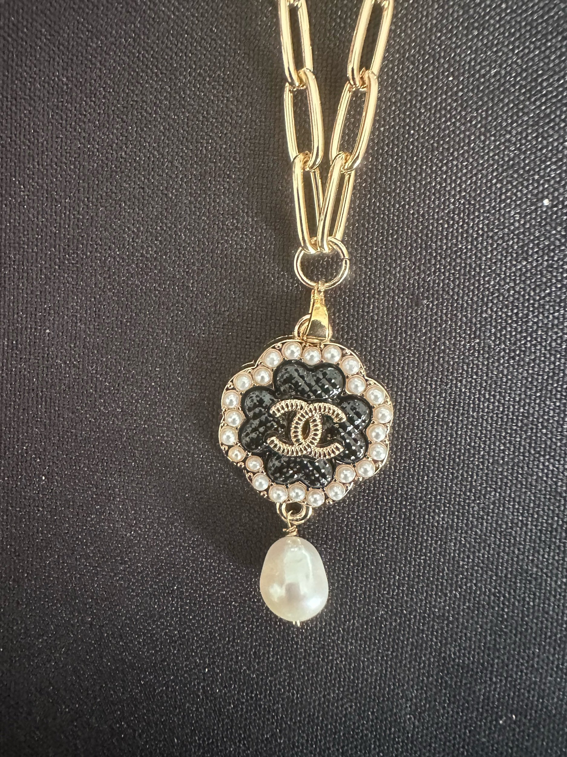 Shop › Black & White Chanel Button Necklace with Pearl Drop Image 1 of 1 Black & White Chanel Button Necklace with Pearl Drop $90.00 Black & White Chanel Button Necklace with Pearl drop on 18 inch chain with 2 inch extension Purchase Added! Black & White Chanel Button Necklace with Pearl drop on 18 inch chain with 2 inch extension Reviews Reviewer Name Review Date Star Rating Description Posted on Etsy Product Show More